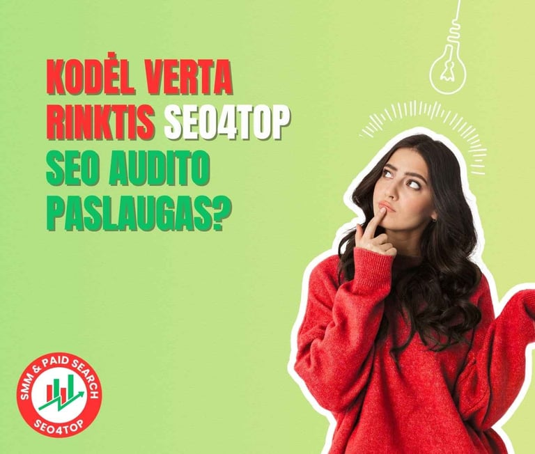 SEO4TOP - skaitmeninės rinkodaros agentūra (Vilnius), teikia išsamią internetinių svetainių SEO audito paslaugą, skirtą techninių klaidų nustatymui ir pozicijų gerinimui Google paieškoje.