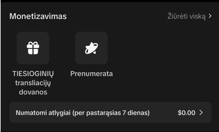 Ši Tik Tok paskyra turi apdovanojimų programą autoriams ir joje yra monetizacijos funkcija.